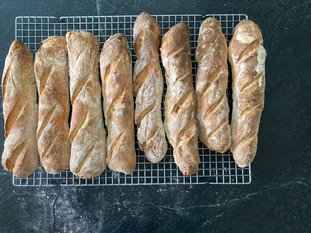 - Remove the pan with the towel and continue to bake for 15-25 minutes, until the baguettes are golden brown. Reomove from the oven and place loaves on a cooling rack.