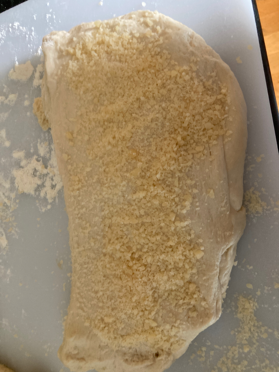 This is a combination of three recipes, the dinner roll recipe we’ve already seen, the recipe from another old but excellent cookbook - A World of Breads by Dolores Casella, and the technique for making cheese breads from Reinhart. We used the first to make the dough and the others to process and bake the dough.