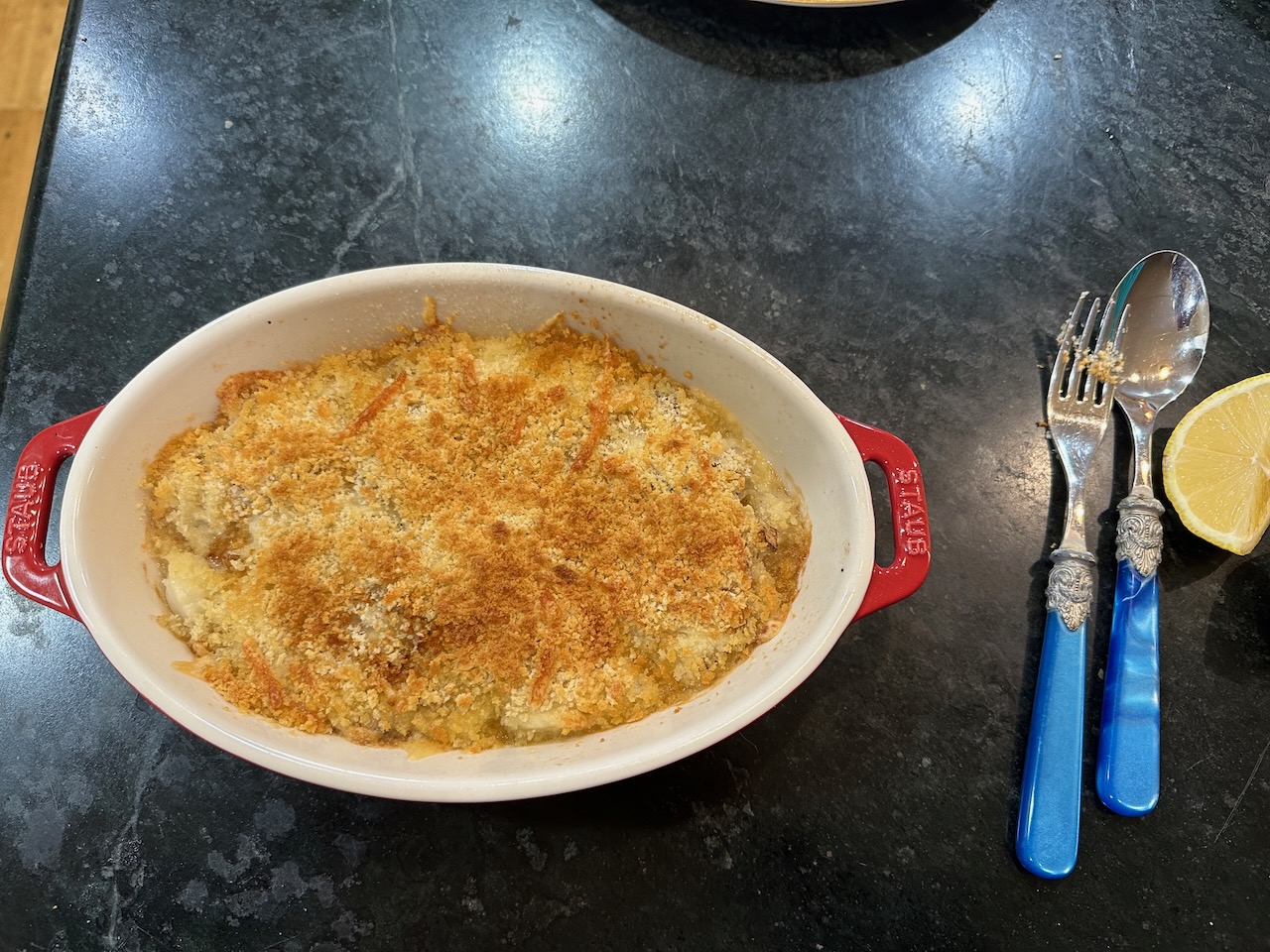 I have also tried this with sea scallops, and it is delicious. However, in the future, I will broil the dish after baking, as for whatever reason, the breadcrumbs didn’t brown sufficiently.
