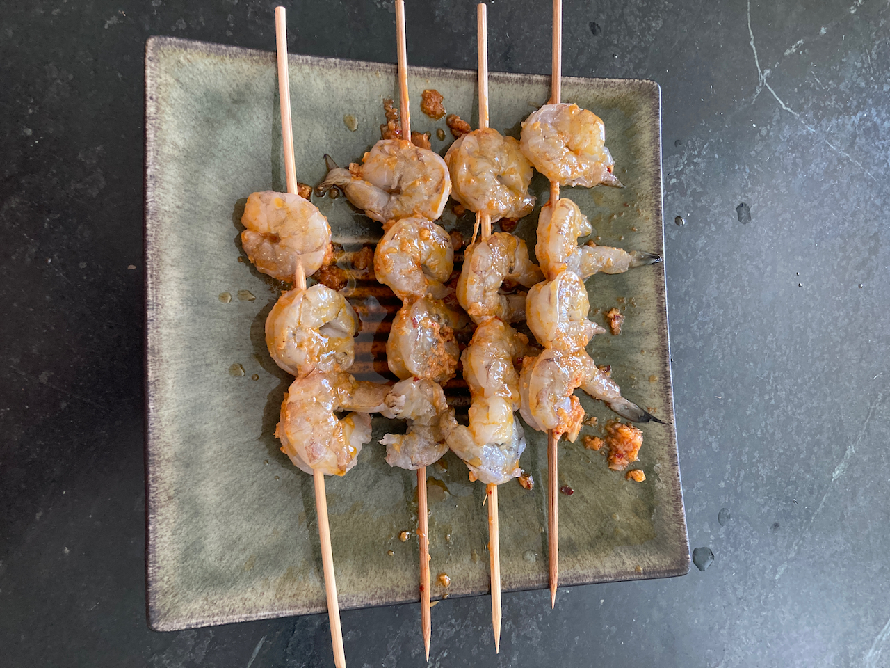 - Thread the shrimp onto the skewers.
